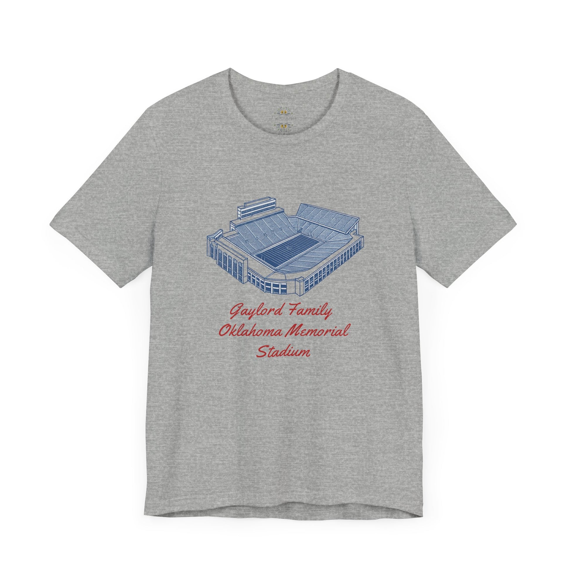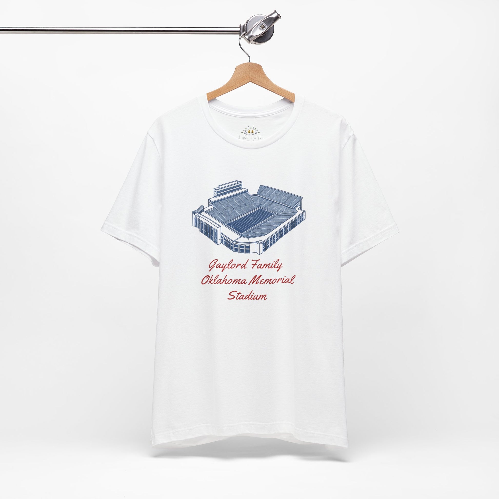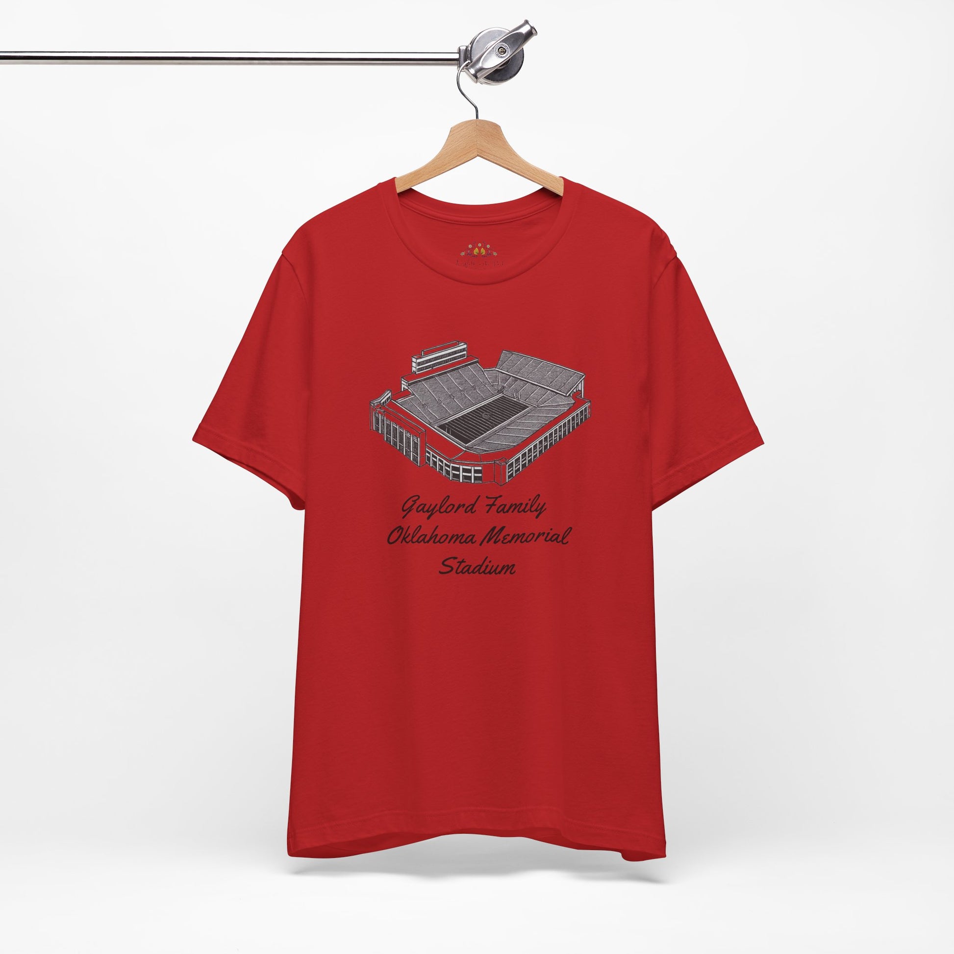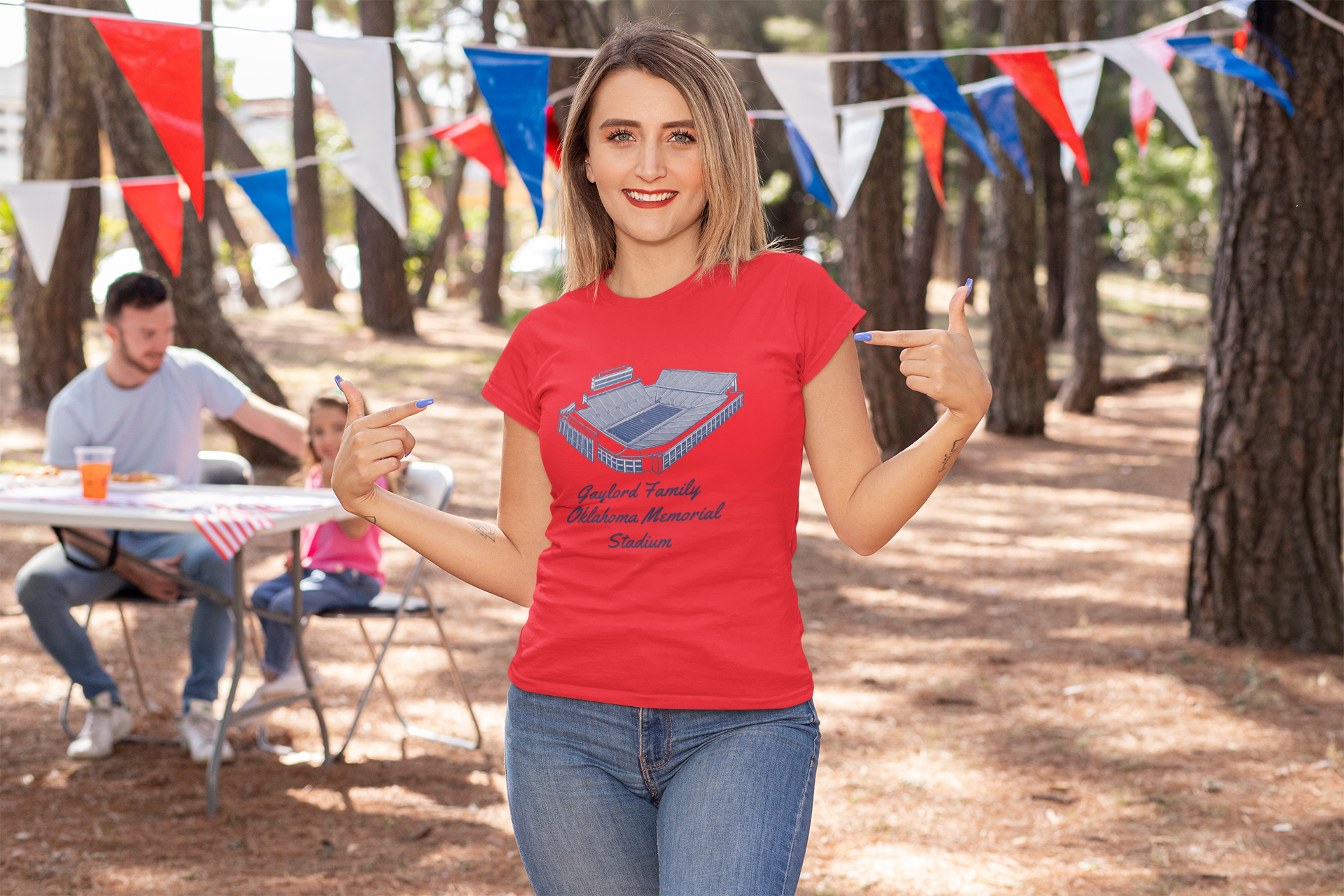 Celebrate game day the Oklahoma way! This bold red tee features a detailed line art illustration of Gaylord Family Oklahoma Memorial Stadium—the legendary home of the Sooners. With a clean, collegiate font and iconic stadium silhouette, it's a must-have for any OU fan who bleeds crimson.
