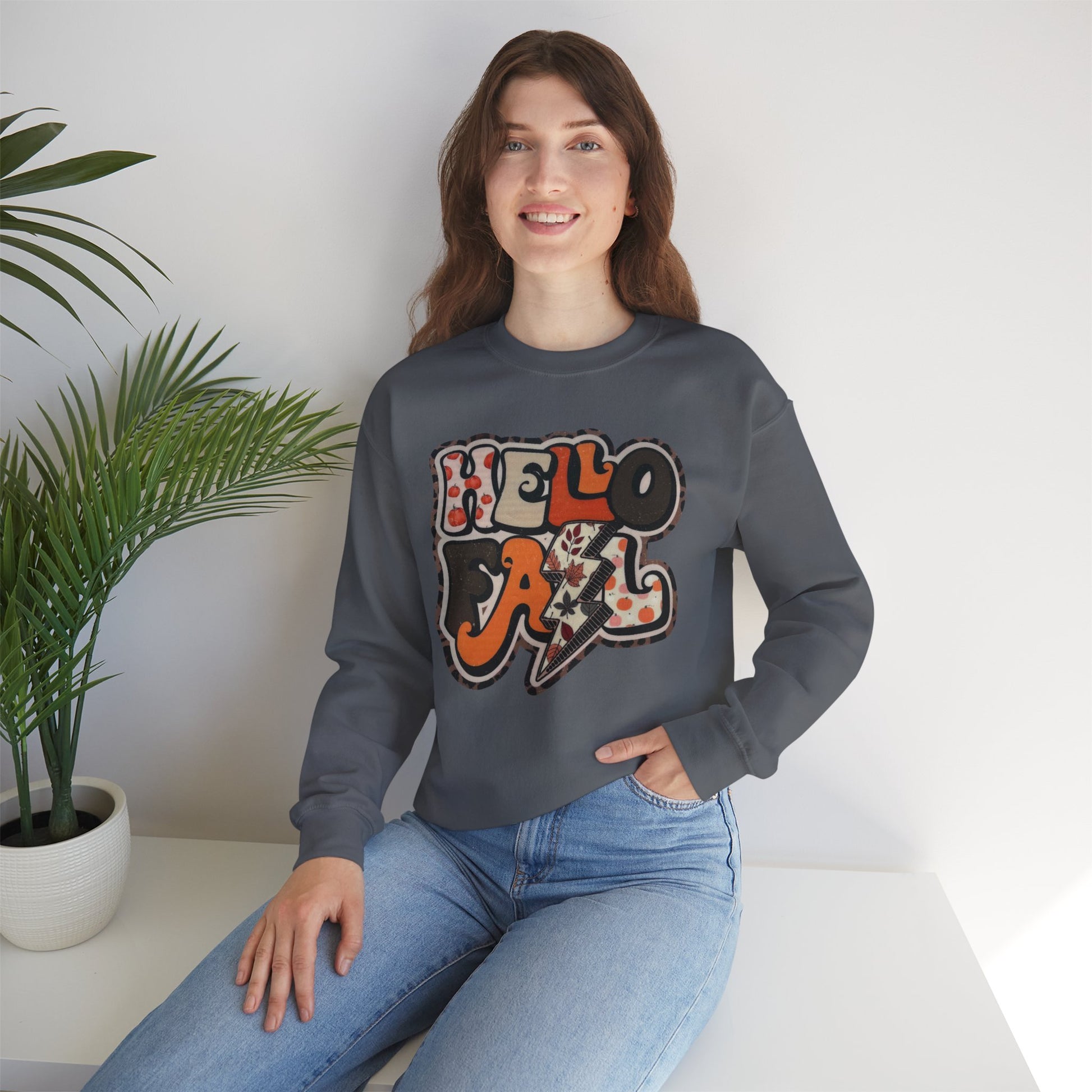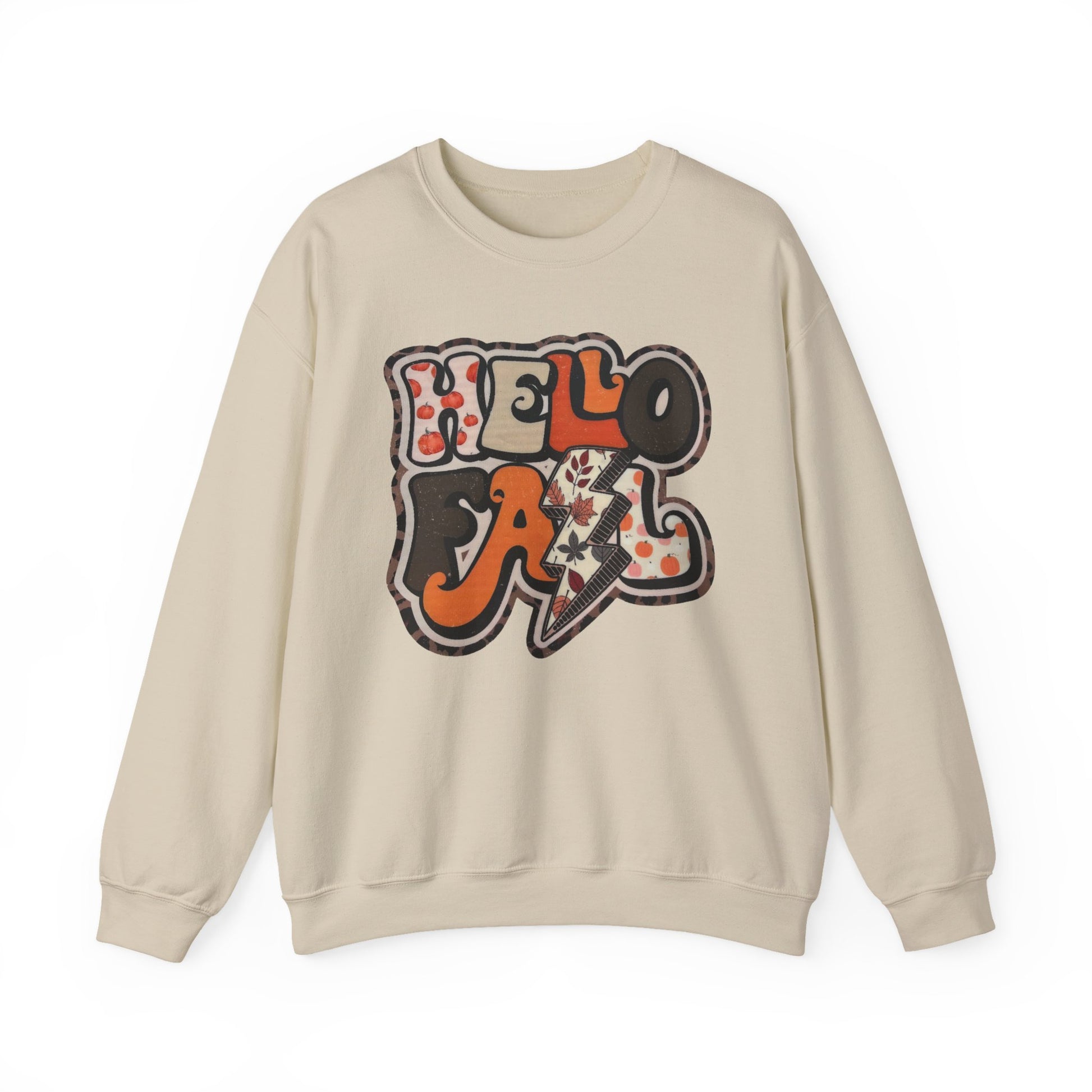 Welcome the season in style with our “Hello Fall” Sweatshirt. Featuring bold retro lettering filled with playful pumpkin and leaf patterns, this cozy pullover is a perfect way to show off your love for autumn. The fun lightning bolt detail adds a trendy touch, while the warm fall colors make it ideal for the season of crisp leaves and pumpkin spice.