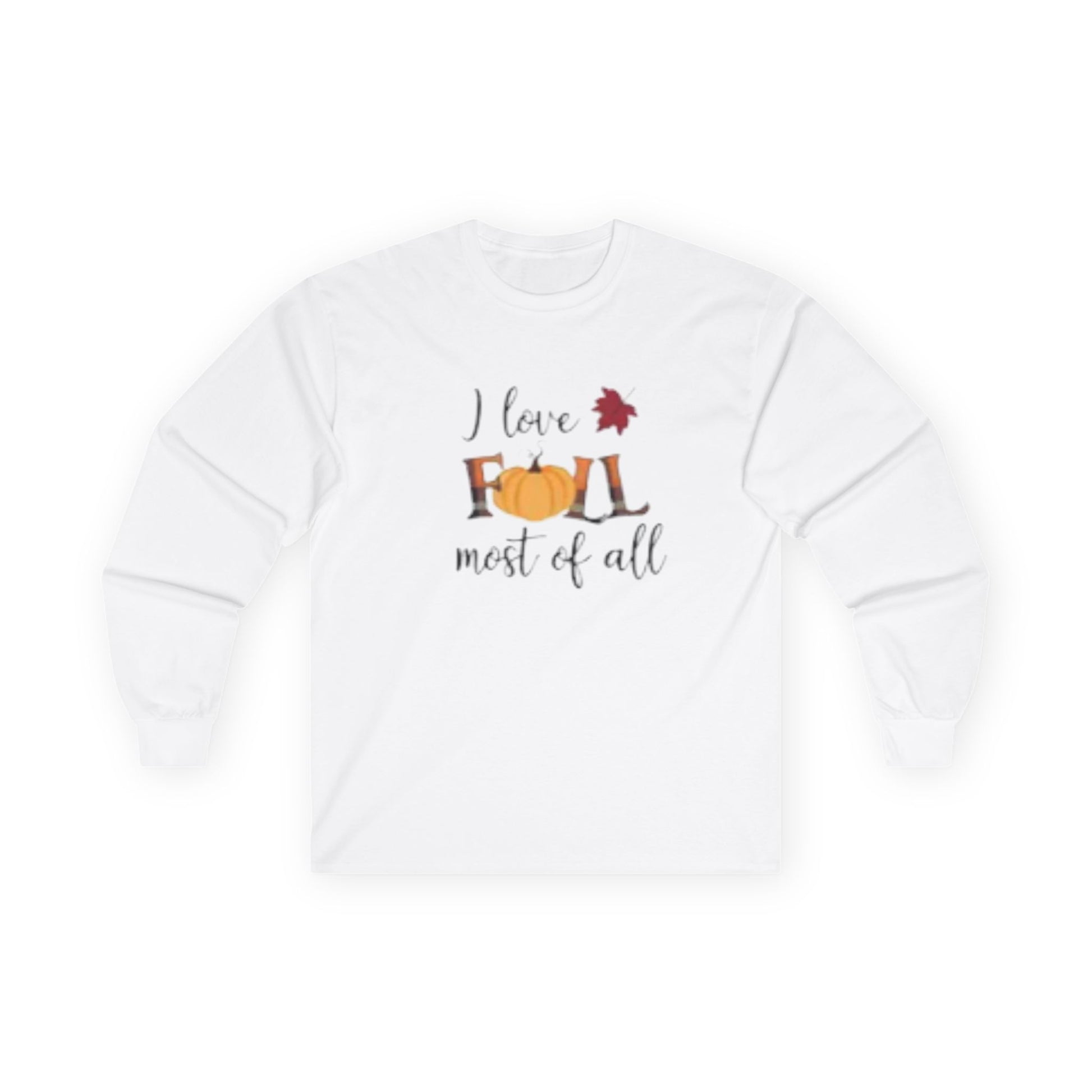 Show off your love for all things autumn with this I Love Fall Most of All Long Sleeve Tee—the perfect addition to your fall wardrobe!