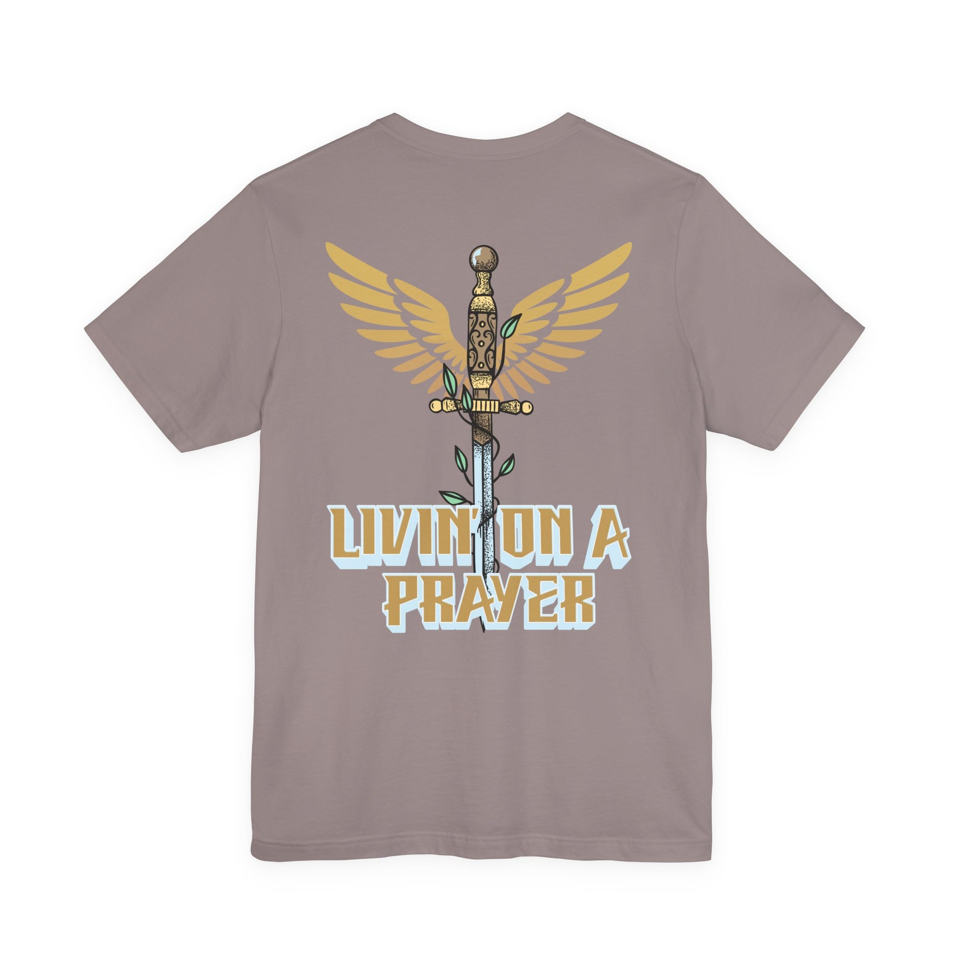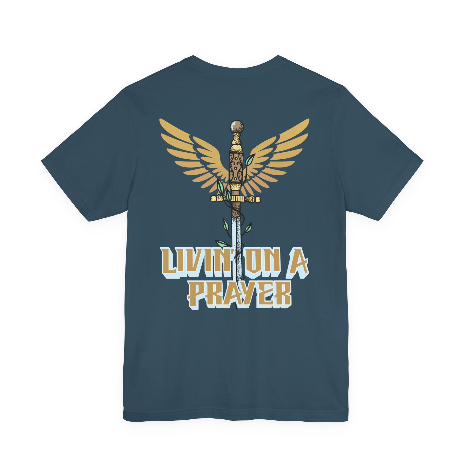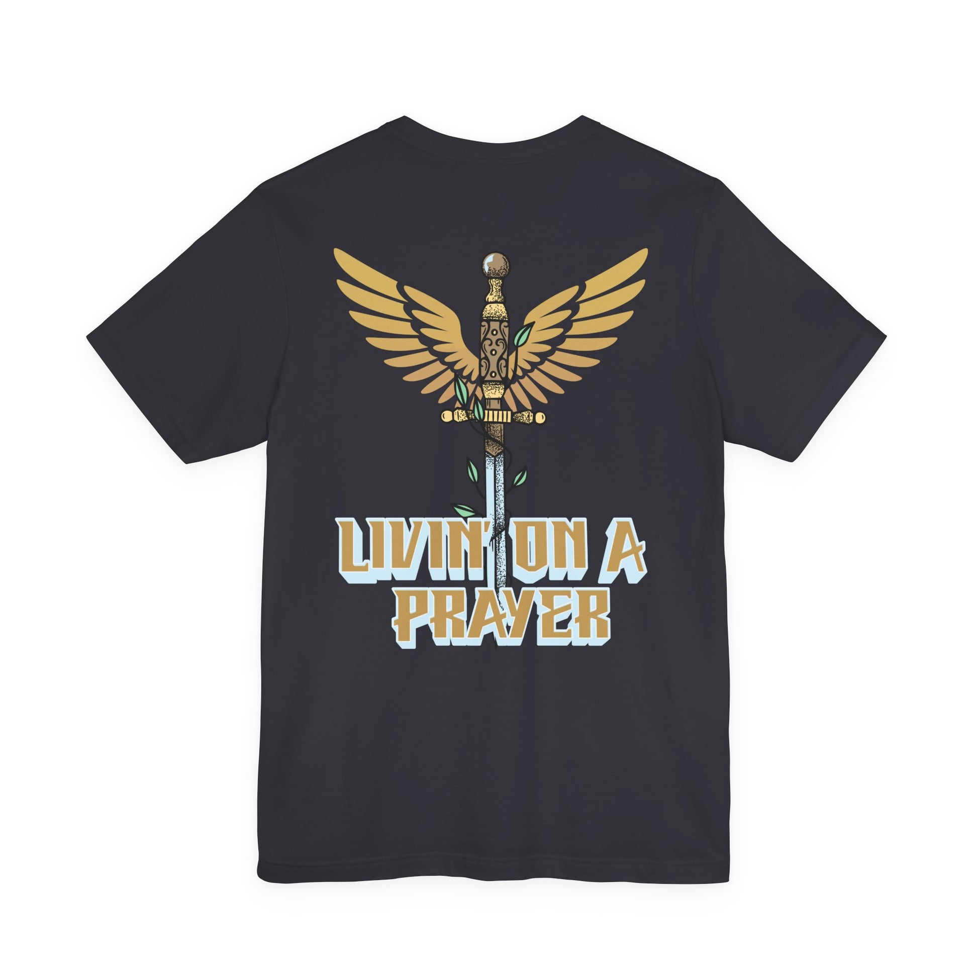 The front features a subtle design with “Pray Without Ceasing” — 1 Thessalonians 5:17, reminding you that prayer is a daily rhythm, not just a moment. The back showcases a bold winged sword graphic paired with “Livin’ On a Prayer,” capturing the heart of what it means to trust God through every battle.
