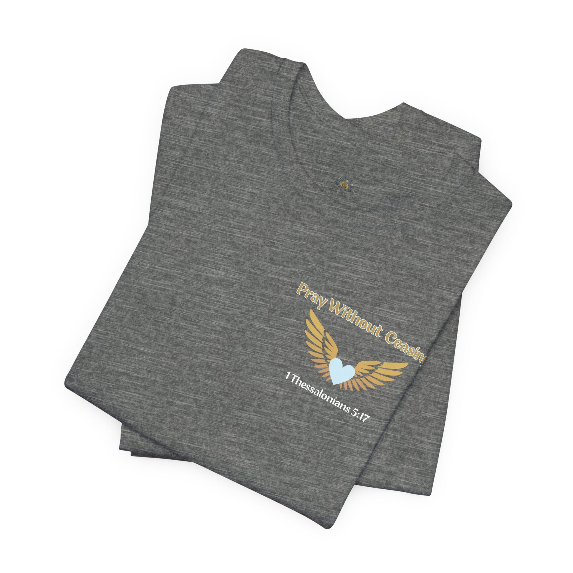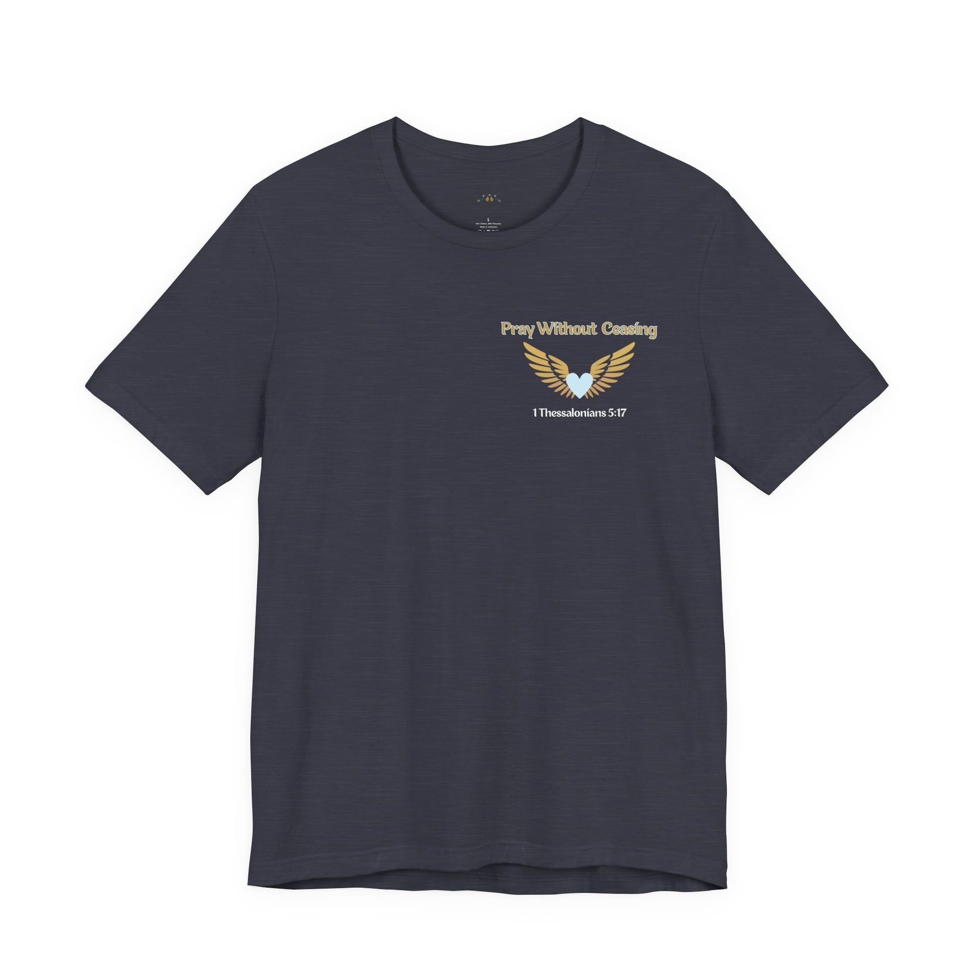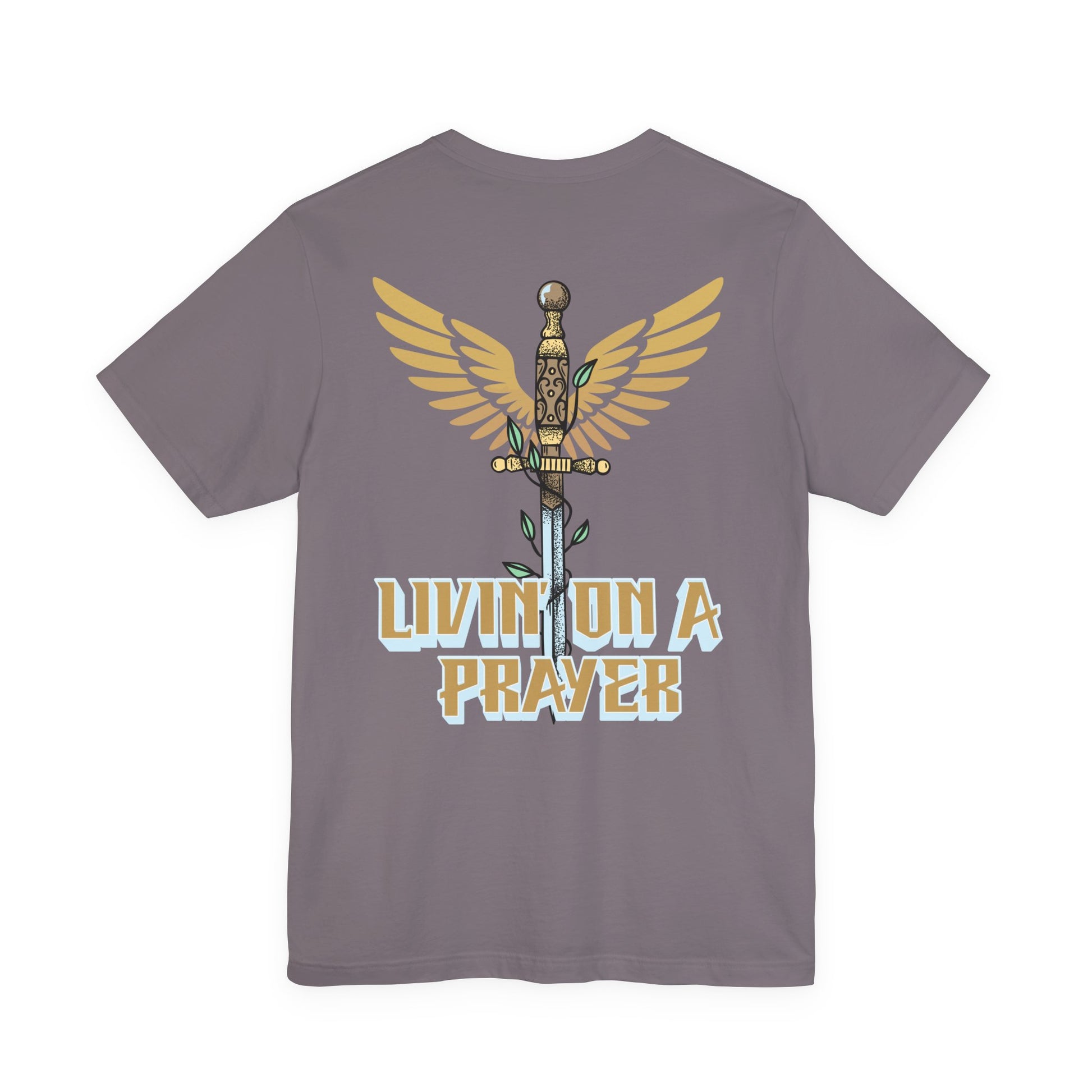 The front features a subtle design with “Pray Without Ceasing” — 1 Thessalonians 5:17, reminding you that prayer is a daily rhythm, not just a moment. The back showcases a bold winged sword graphic paired with “Livin’ On a Prayer,” capturing the heart of what it means to trust God through every battle.