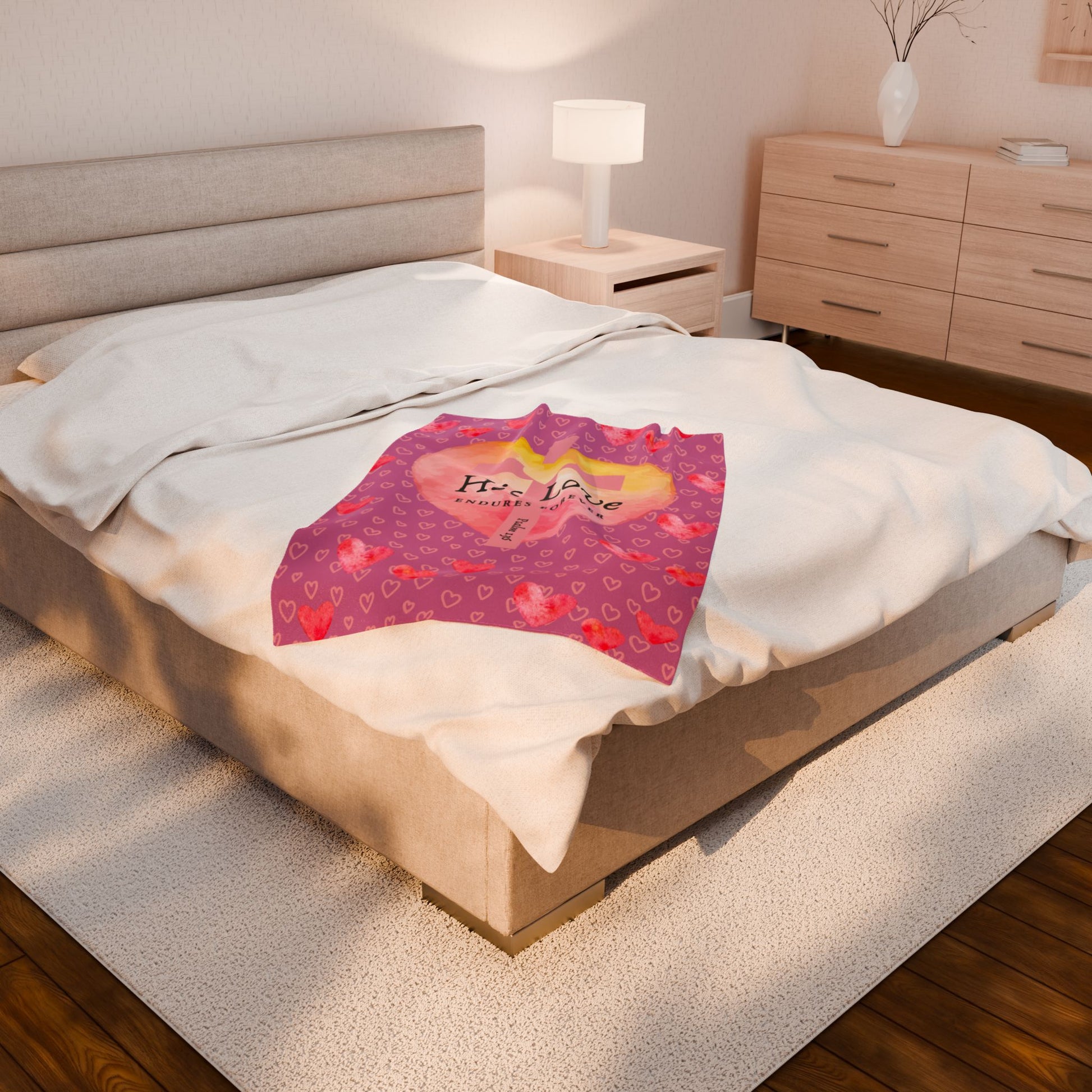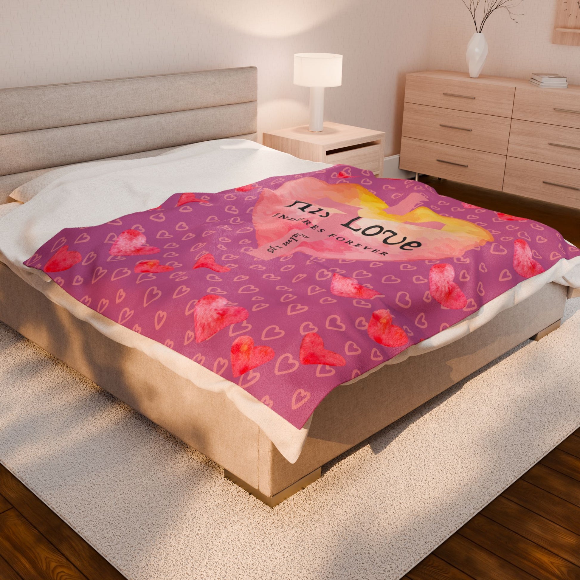 Soft blanket perfect for Galentine's Day featuring Psalm 136 "His Love Endures Forever" with a heart and cross design element. It gives a cozy and warm feeling, perfect for snuggling up with loved ones. Ideal for those looking for a thoughtful gift for Galentine's Day or Valentine's Day.