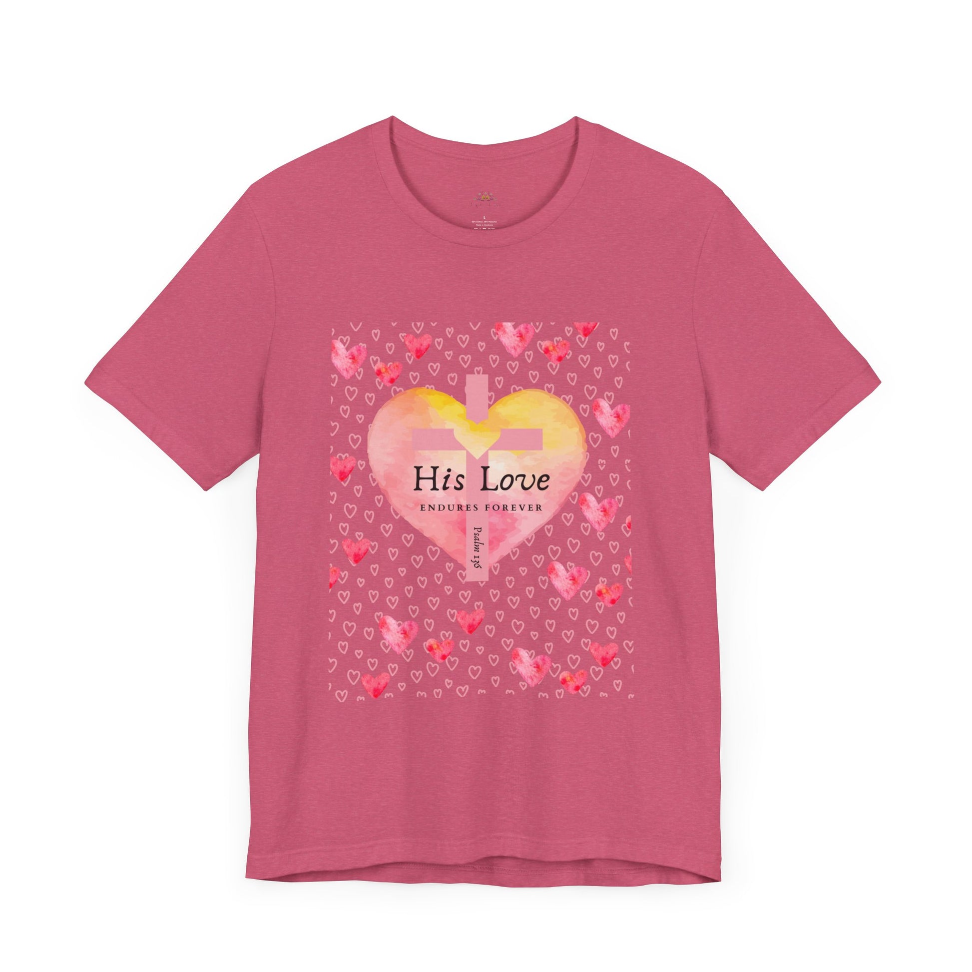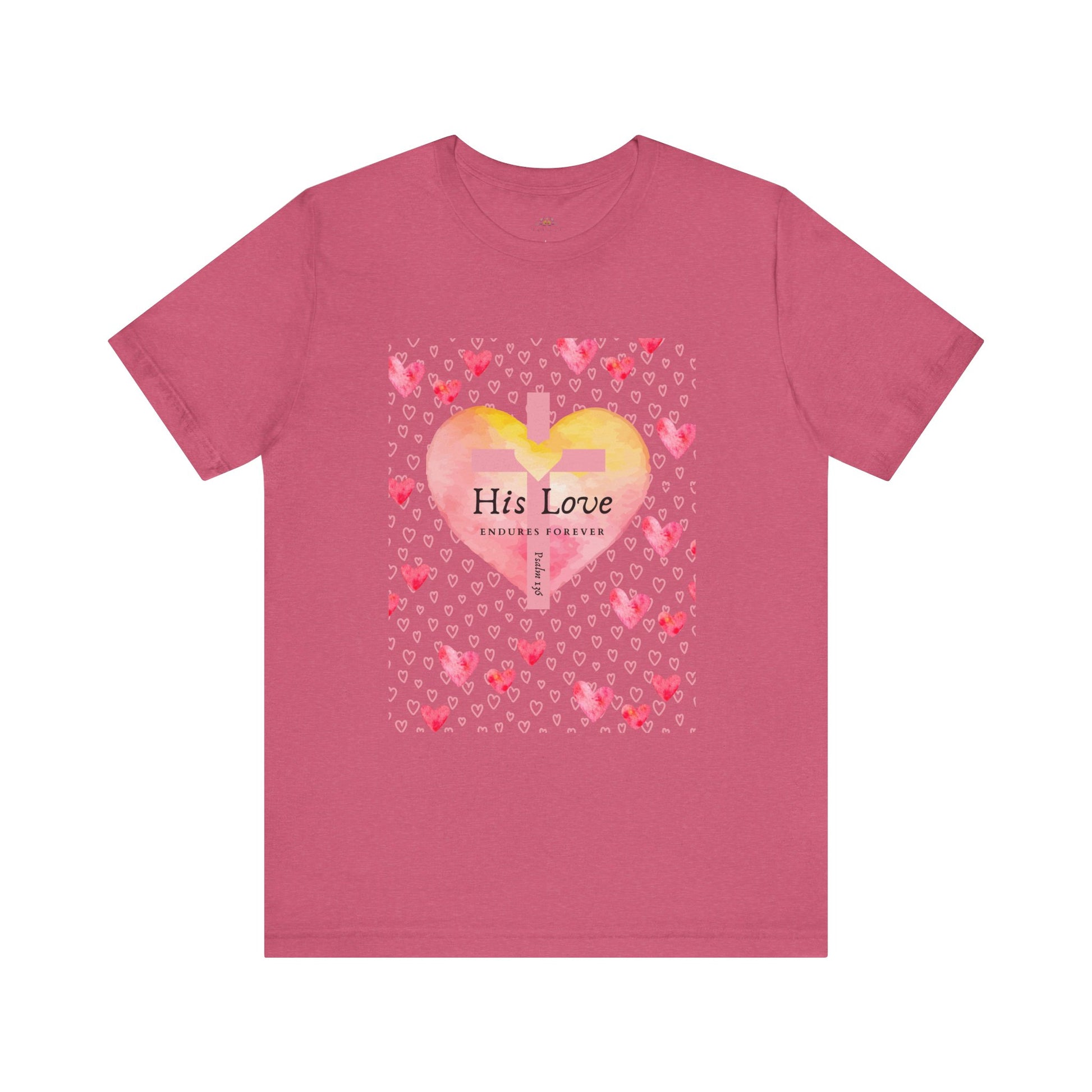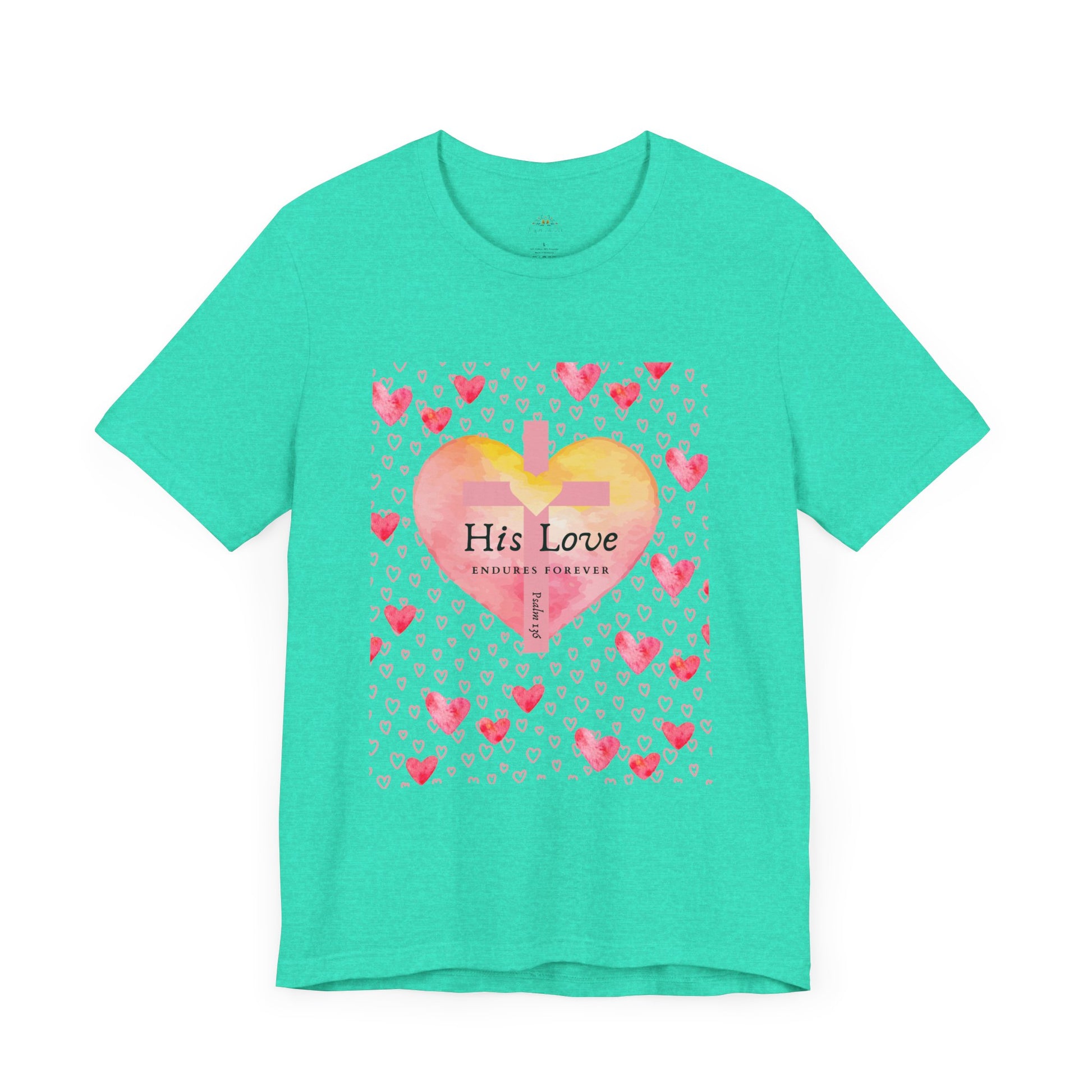 Express your faith boldly and beautifully with this faith-inspired women’s t-shirt, featuring a stunning watercolor heart, a cross-centered design, and the powerful verse Psalm 136: "His Love Endures Forever."