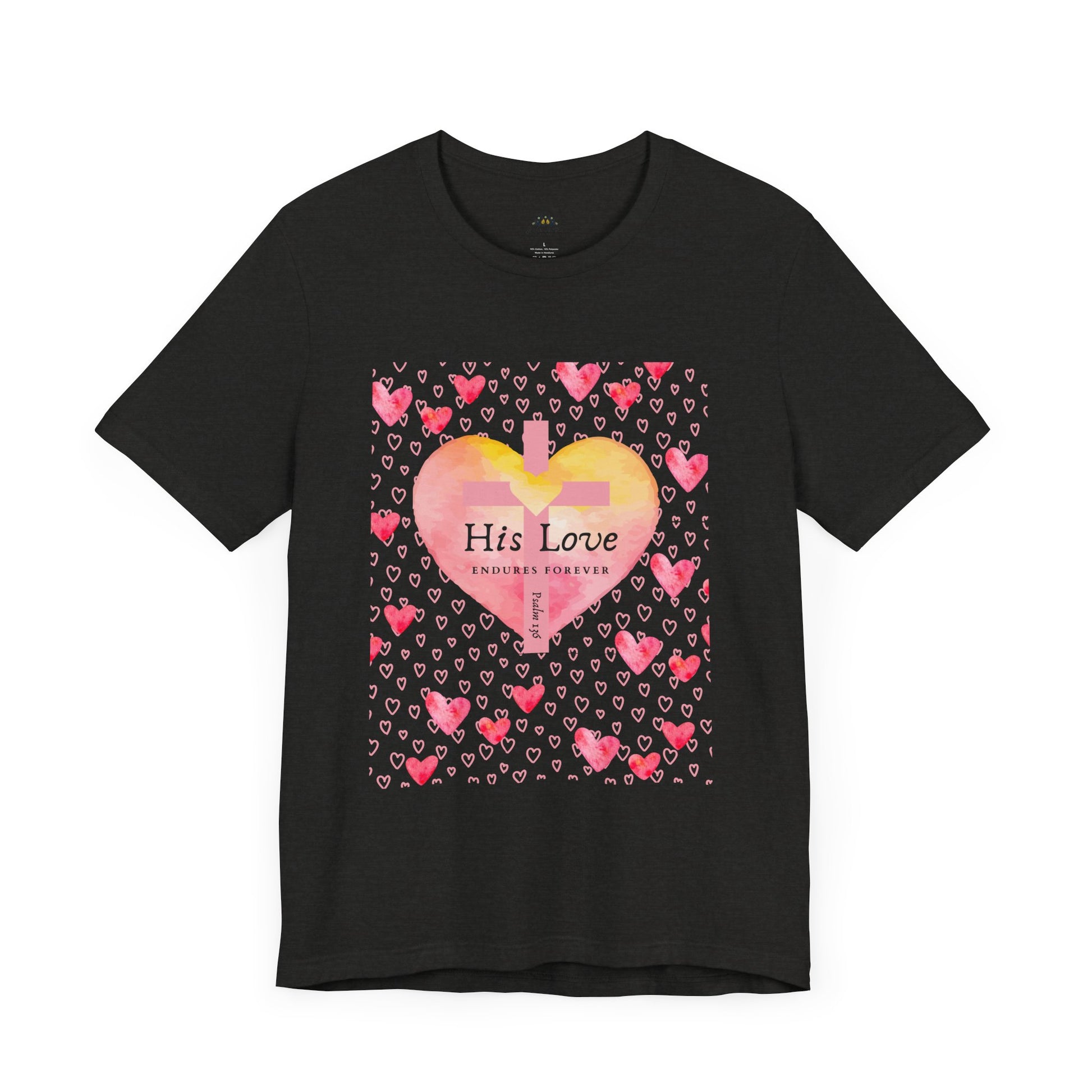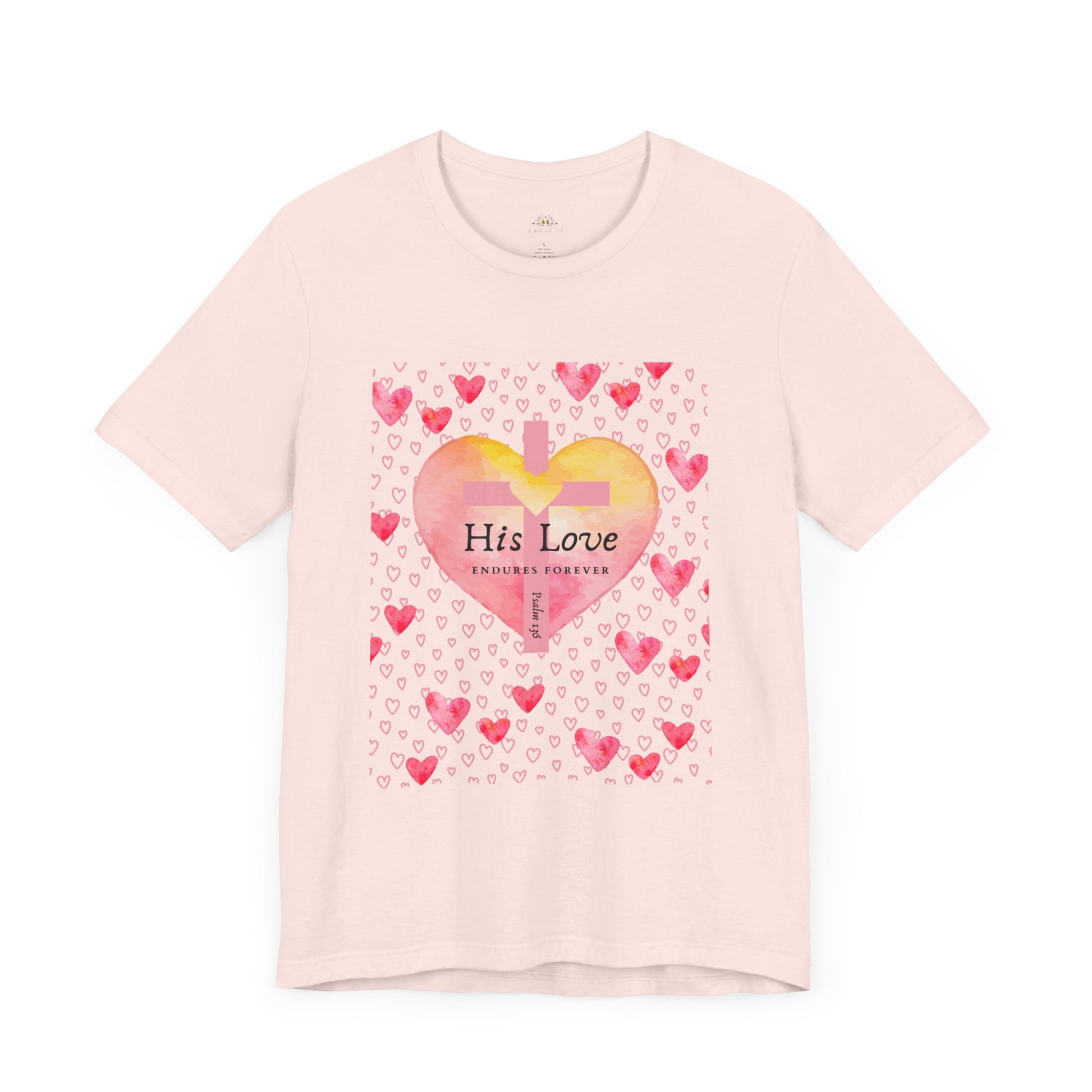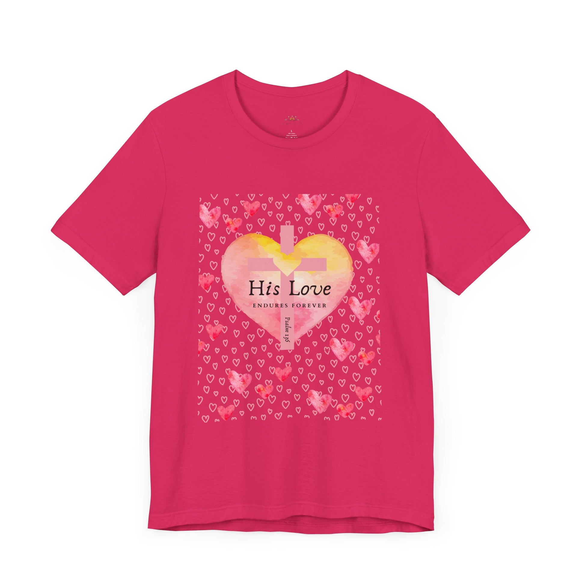 Express your faith boldly and beautifully with this faith-inspired women’s t-shirt, featuring a stunning watercolor heart, a cross-centered design, and the powerful verse Psalm 136: "His Love Endures Forever."